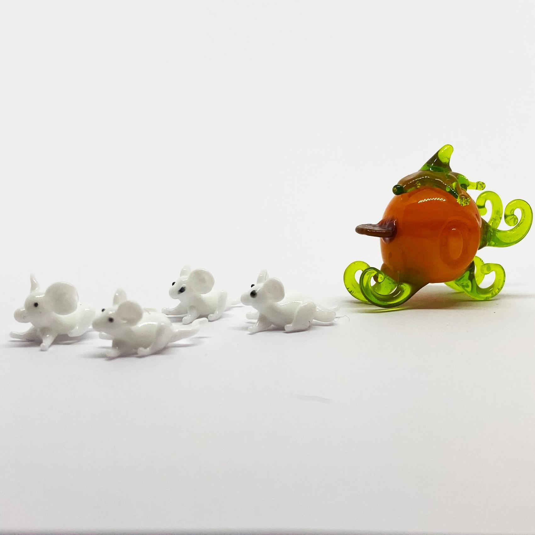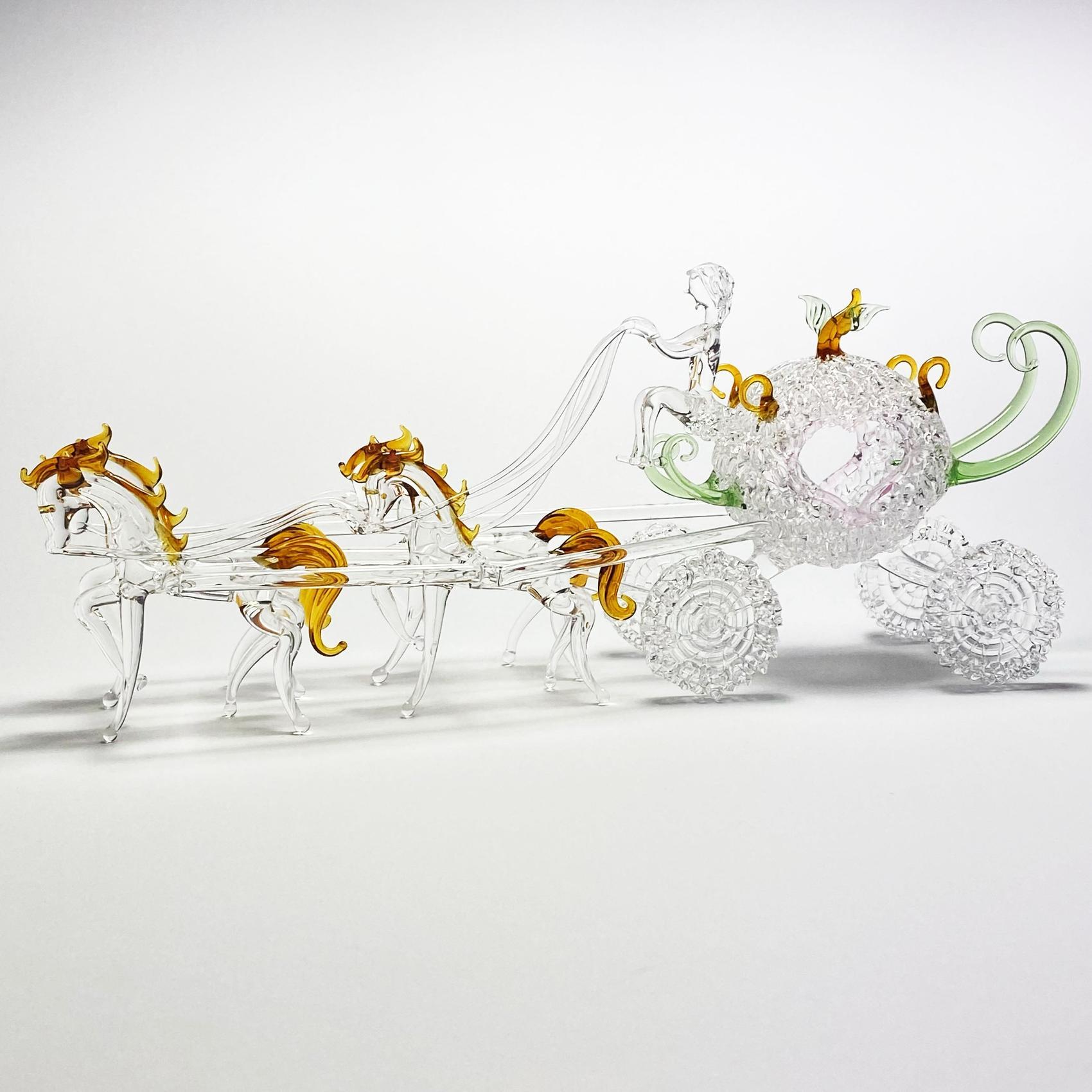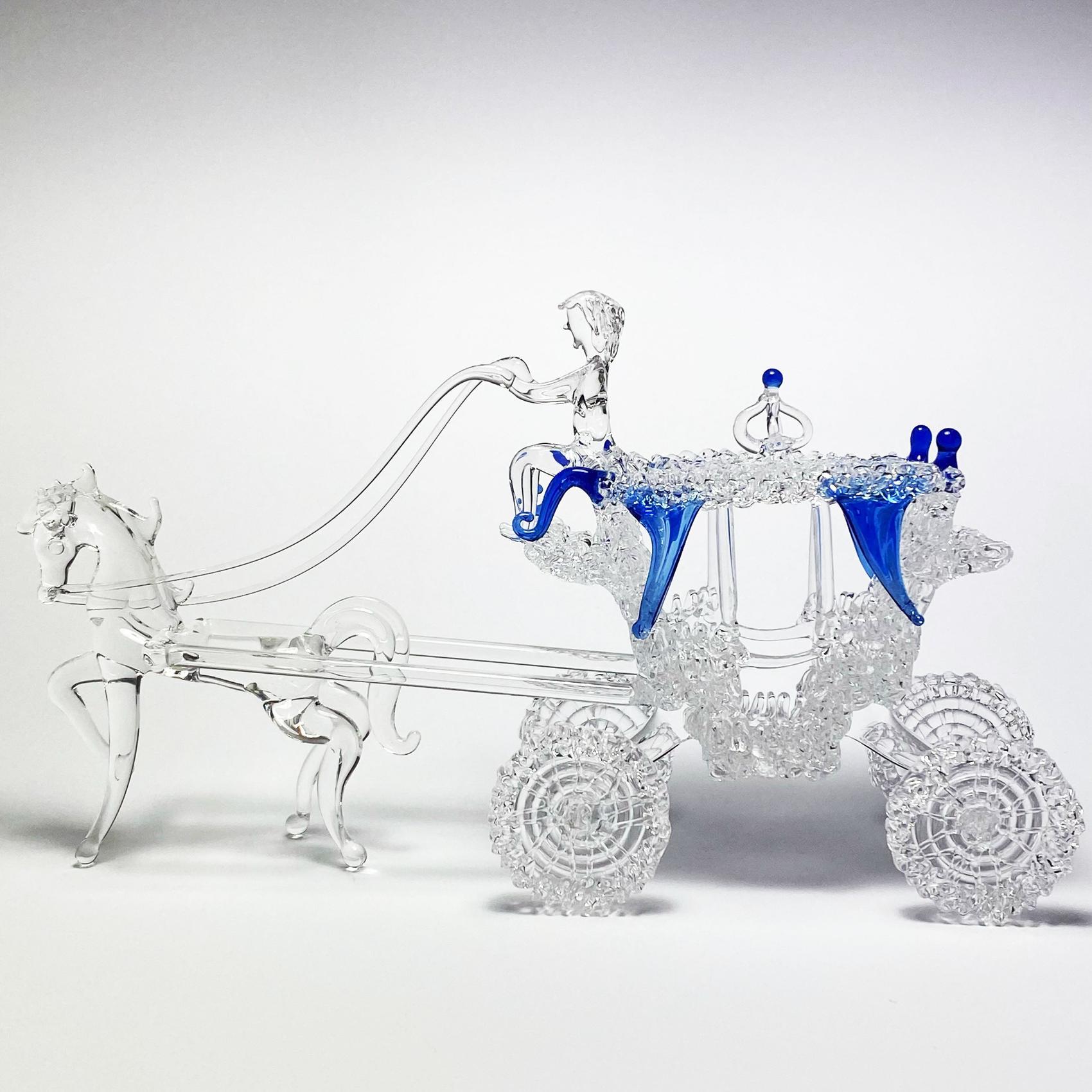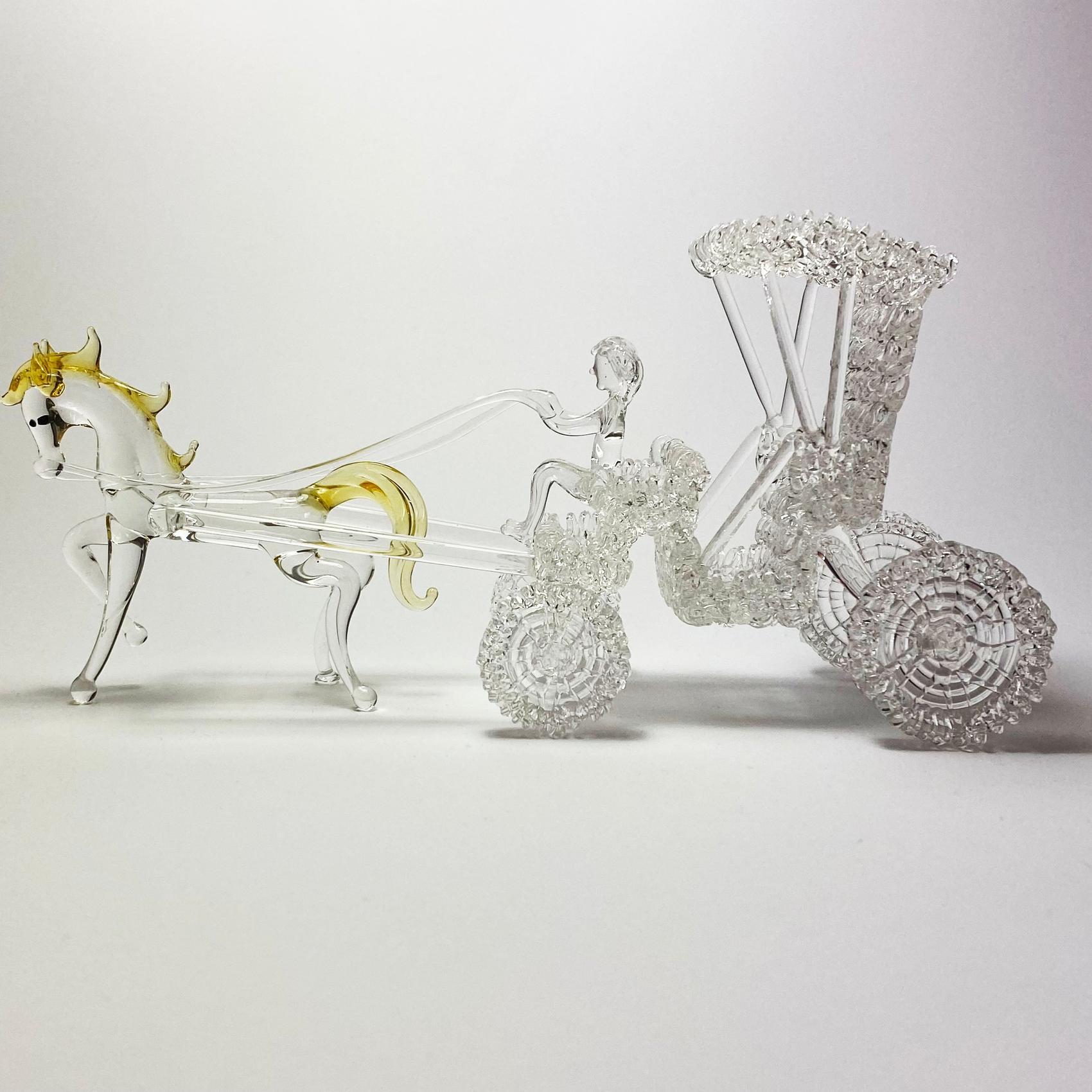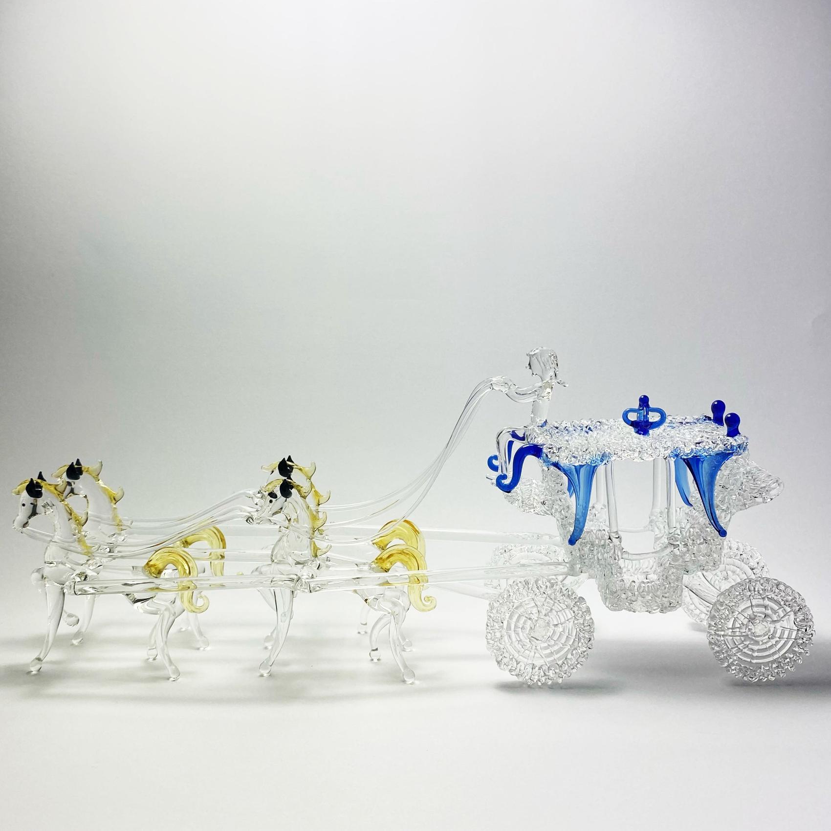 Esculturas de vidrio con forma de carruajes realizadas en borosilicato transparente y detalles de color.